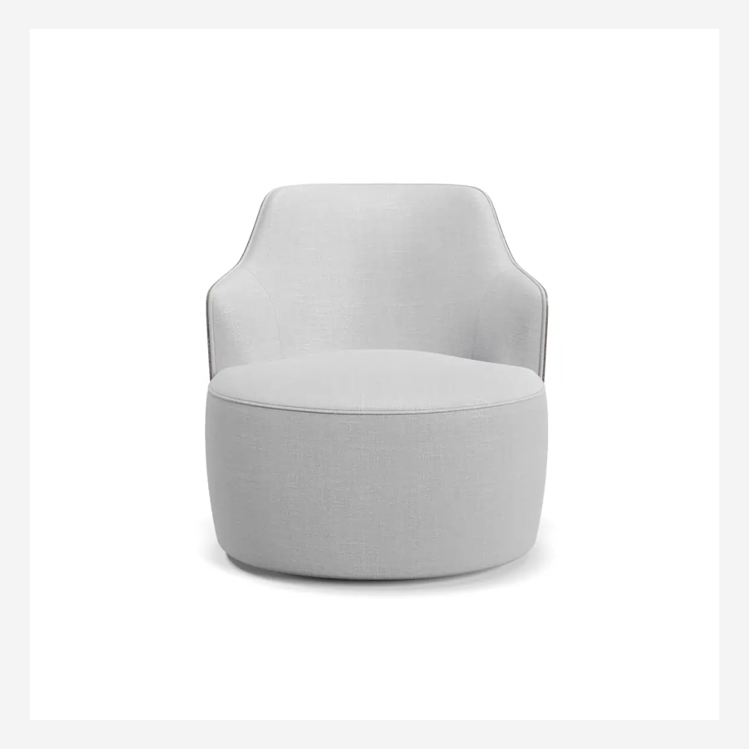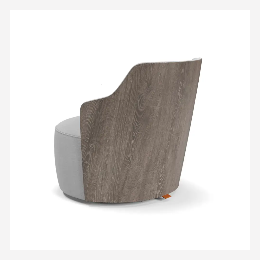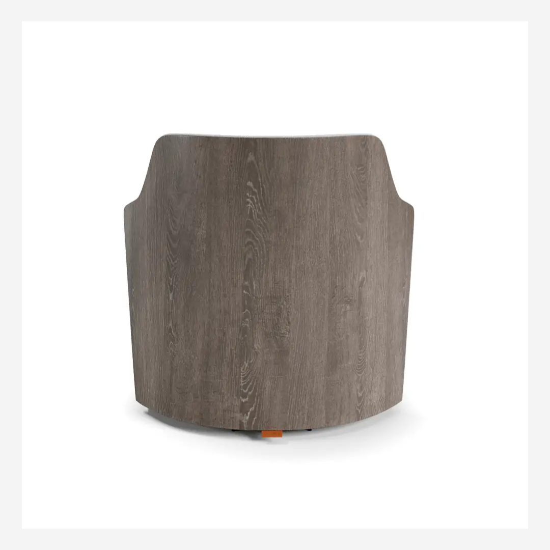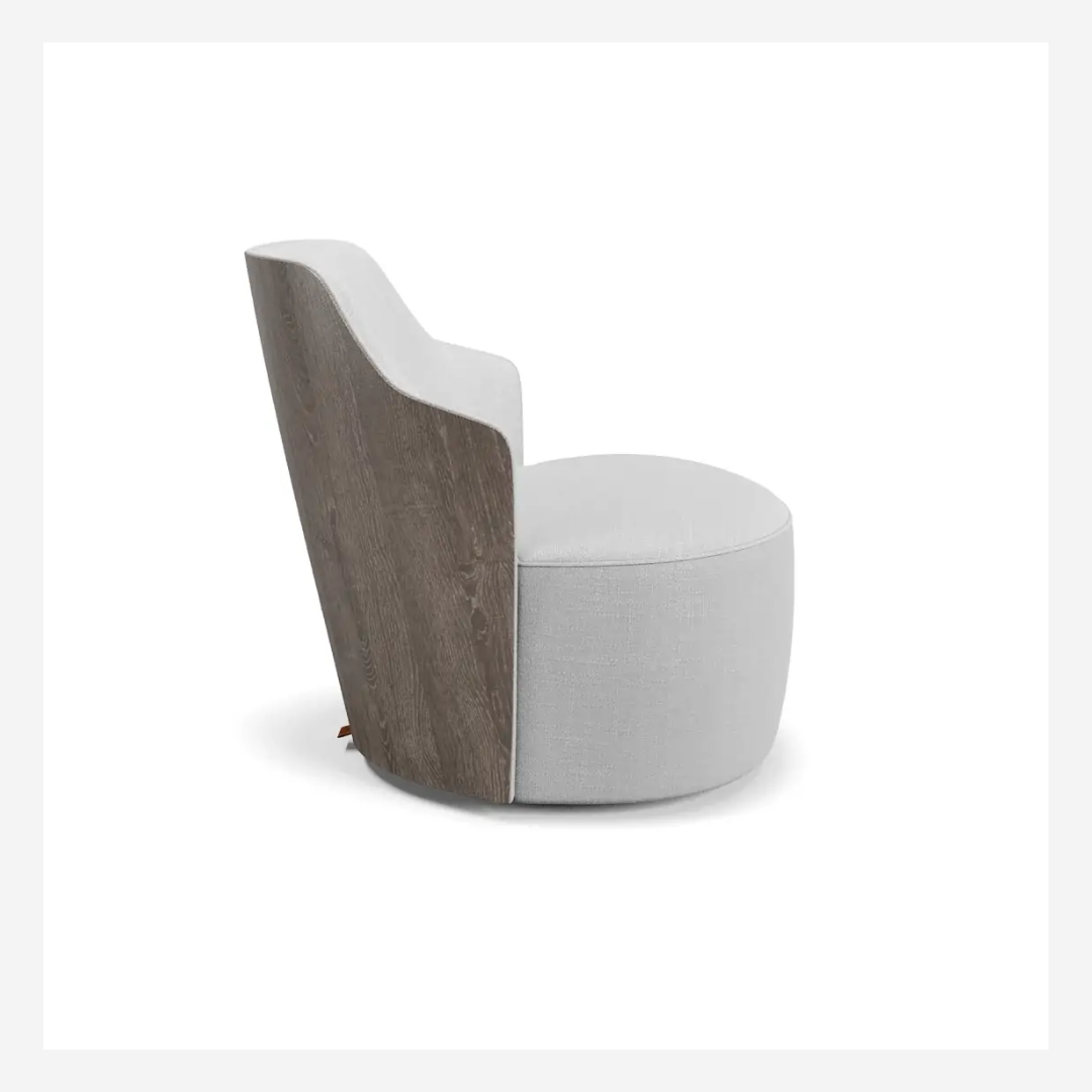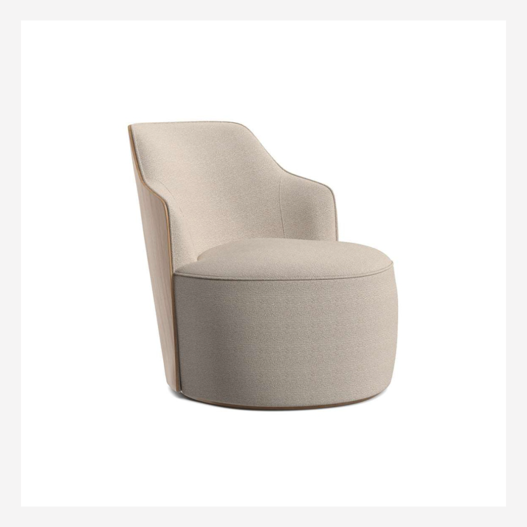 Cartagena Accent Chair — A refined piece that merges bold shape with subtle elegance. Featuring a fixed seat and a beautifully contoured wooden backrest available in laminated, lacquered, or leather finishes. The base can be fixed or swivel, in black microtextured carbon steel or polypropylene. Designed to elevate both comfort and craftsmanship.