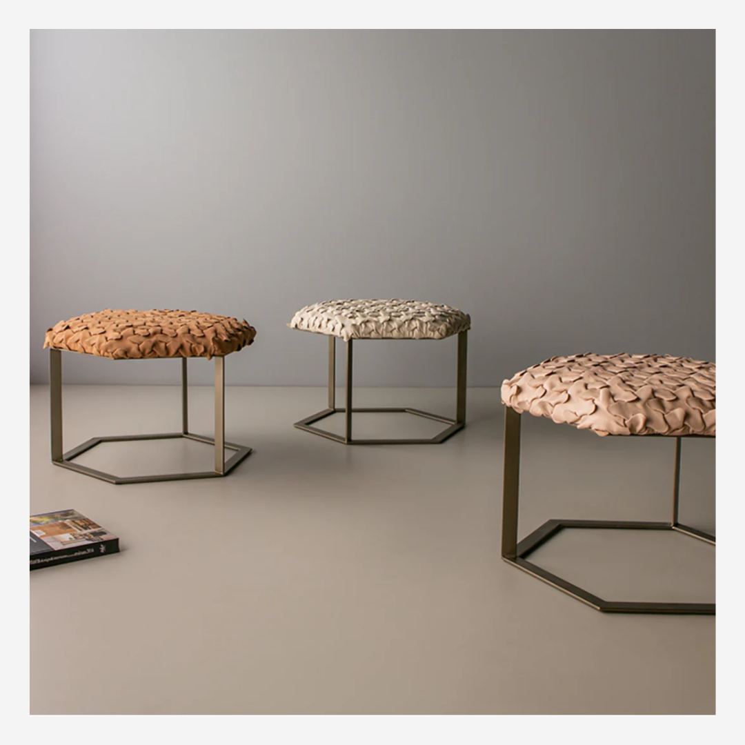 An artistic tribute to handcrafted Brazilian heritage, the Fuxico Ottoman reinterprets traditional textile techniques in a contemporary silhouette. The hexagonal metal base contrasts beautifully with the richly textured seat in gathered leather, creating a sculptural accent with emotional depth and artisanal refinement.
