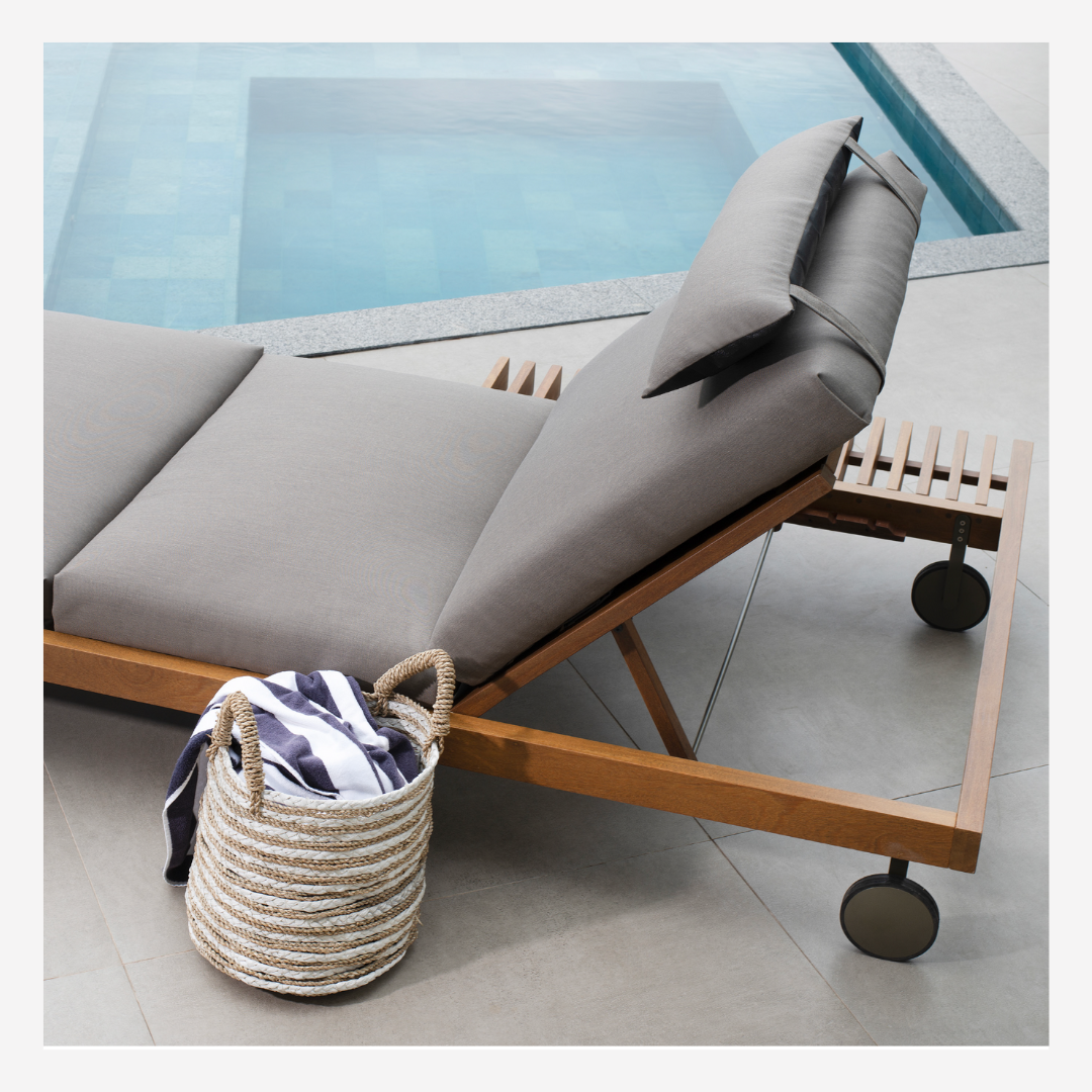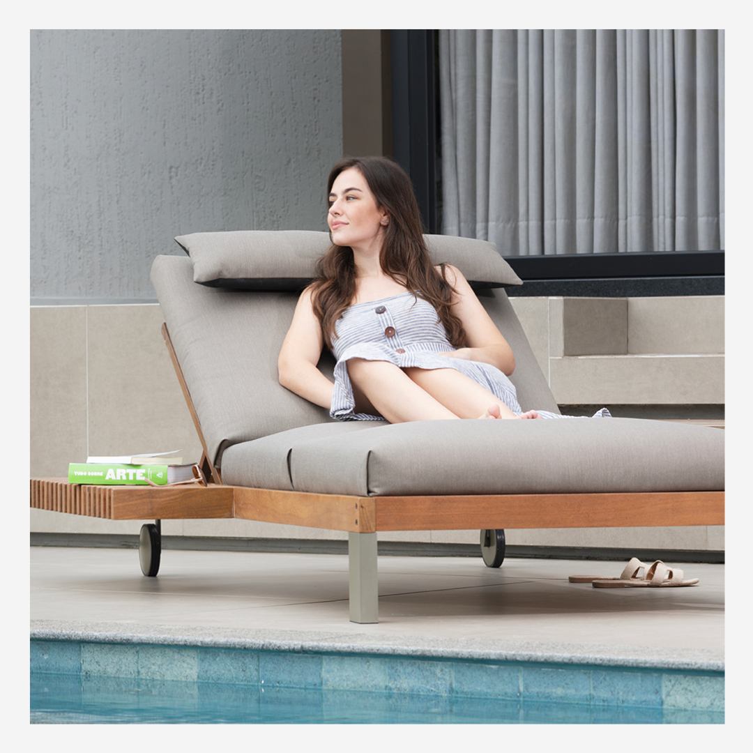 With or without fabric, the piece adapts seamlessly to sophisticated poolside areas, terraces, and patios. Its low profile and angled backrest ensure both comfort and visual lightness.